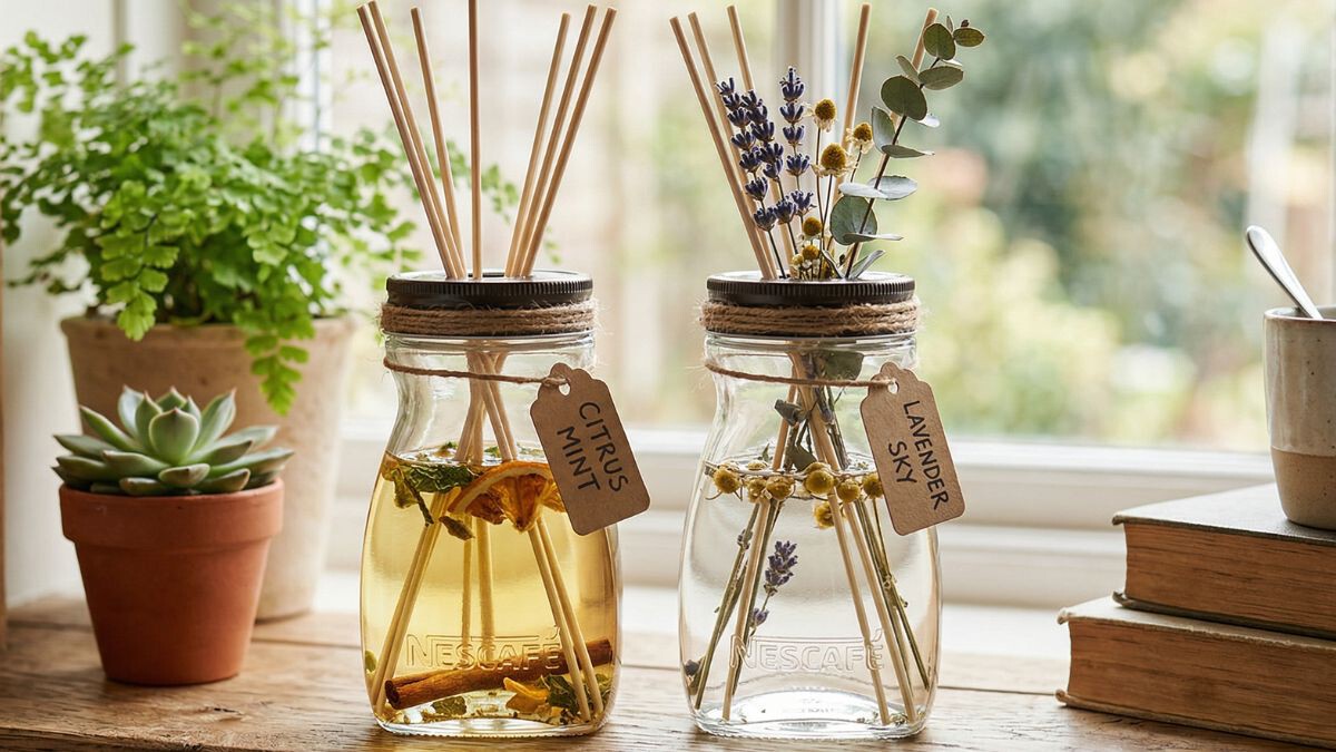 Stecke Holzstäbchen oder Schaschlikspieße hinein und schon hast du einen einfachen, aber sehr dekorativen Diffusor. Außerdem kannst du das Glas mit Etiketten oder Bändern individuell gestalten, damit es zu deinem Stil passt.