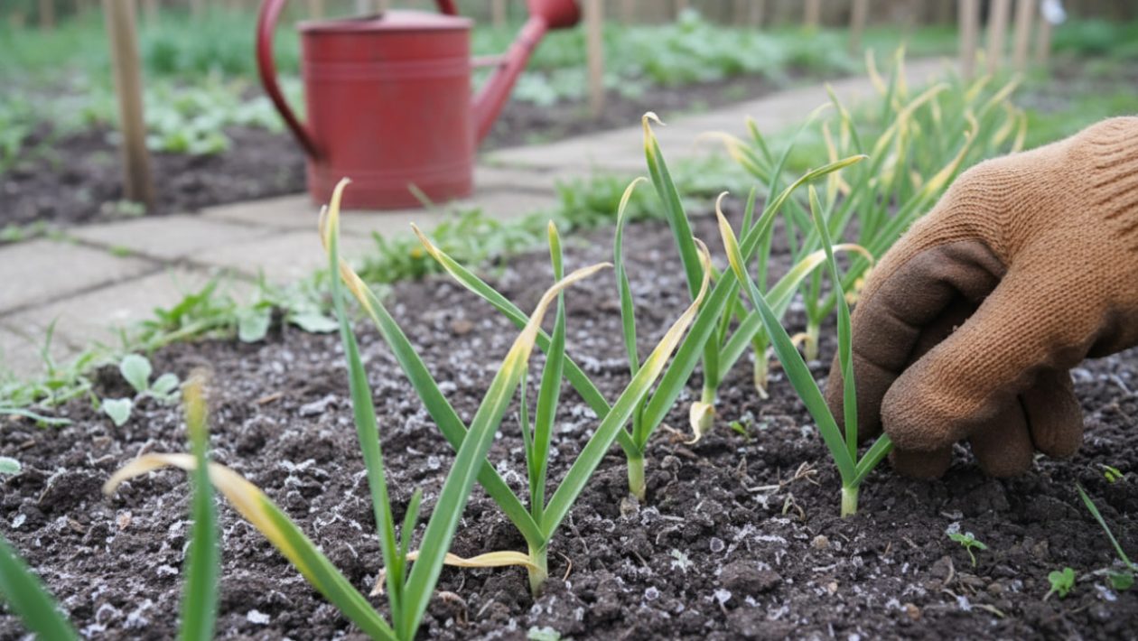 Der fatale Gärtner-Fehler: Weil die gelben Spitzen vertrocknet aussehen, glauben viele, der Knoblauch habe Durst. Sie ertränken das Beet regelrecht mit Wasser. Das kalte Wasser kühlt den Boden jedoch noch weiter aus! Schlimmer noch: Die Erde verschlammt, es entsteht Staunässe, die Wurzeln ersticken, der Knoblauch fängt tief unten an zu faulen (Zwiebelfäule) und stirbt unwiderruflich ab.