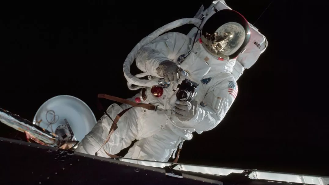 Astronaut Russell L. Schweickart unternimmt während der Apollo-9-Mission einen Weltraumspaziergang mit seiner Hasselblad-Kamera.