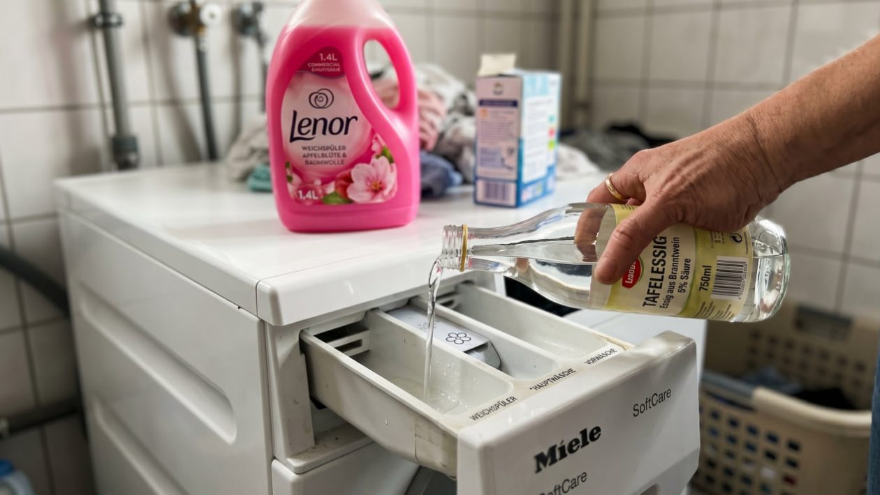 Die Lösung: Füllen Sie anstelle des teuren Weichspülers einfach einen Schuss gewöhnlichen Essig in das Weichspülerfach (das Fach mit dem Blumen-Symbol) Ihrer Waschmaschine!