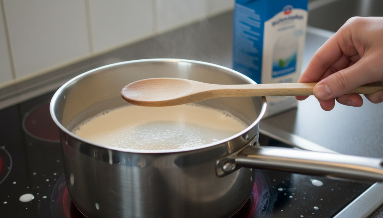 Warum das funktioniert: Holz ist ein extrem schlechter Wärmeleiter. Der Löffel über dem Topf ist also wesentlich kühler als der aufsteigende, heiße Milchschaum. Sobald die hochkochenden Schaumblasen das kalte Holz berühren, platzen sie durch den plötzlichen Temperaturunterschied (Kälteschock) sofort in sich zusammen. Zudem bricht der Löffel die Oberflächenspannung mechanisch auf. Die Milch blubbert wild, bleibt aber im Topf! (Achtung: Funktioniert nur bei leichter bis mittlerer Hitze, nicht wenn Sie den Herd auf Stufe 9 voll aufdrehen!)
