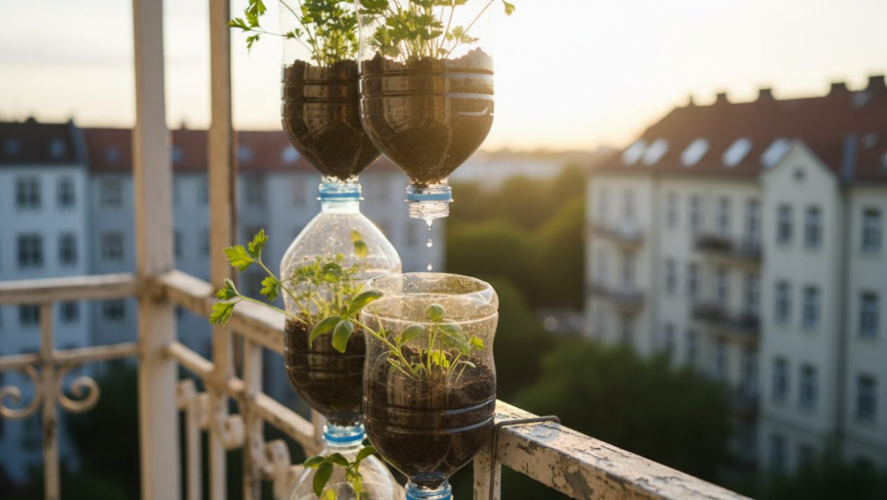 Aus leeren Pfandflaschen vom Späti oder Supermarkt bauen Sie in unter 10 Minuten eine grüne Wand, die sich völlig autonom selbst bewässert – und gleichzeitig neugierige Blicke der Nachbarn abwehrt.